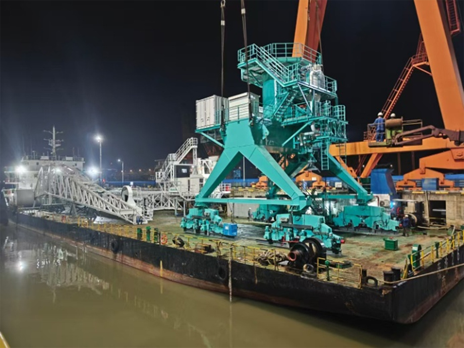 5月16日晚,夜幕深垂,格雷特重工科技码头依旧灯火通明,1300T/H卸船机顺利完成大件装船,启航前往菲律宾。